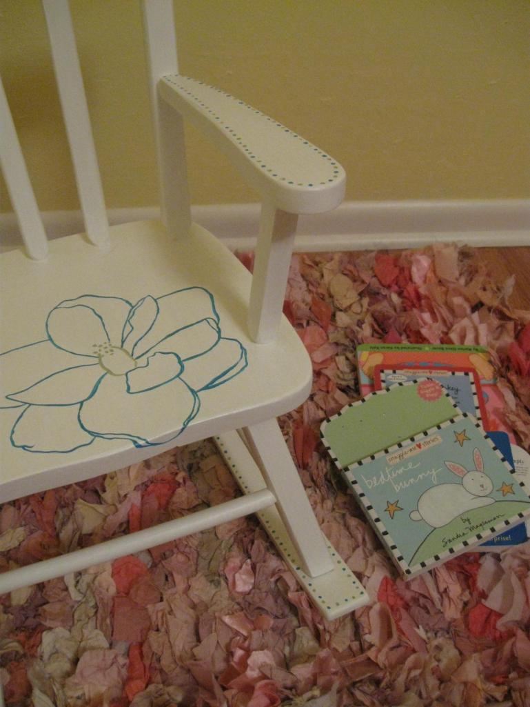 I originally did want to put it under her play table, which is waiting to be stained. After putting it down on the floor, I don’t think it would be big enough anyway. But it is perfect for a new reading corner! My Aunt gave Little Lady a rocking chair right after she was born. Smart lady that she is, she left it white so I could decorate it however I wish. Thanks Aunt J! I can’t remember what other project I had been doing, but I had leftover blue and green acrylic paint already mixed. When I take the time to mix an awesome color, I want to use every drop. Anyway, I ended up staying up until nearly midnight to decorate this little chair. I was wiped out for work the next day, but it was totally worth it. And now a sweet chair meets a fluffy rug for a match made in heaven. Add a little stack of books, and we have a spot made for reading.