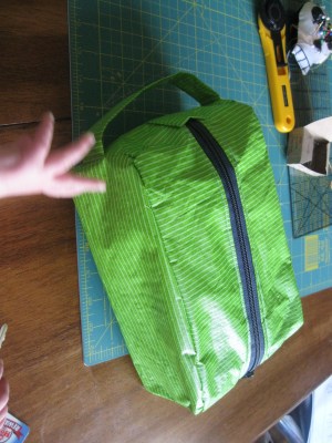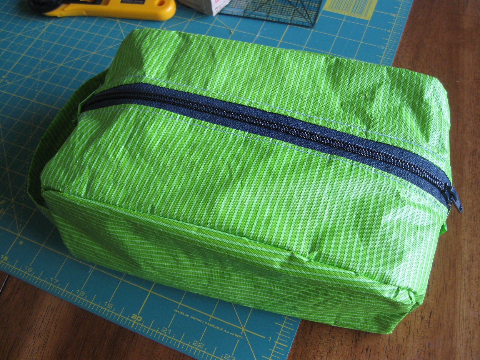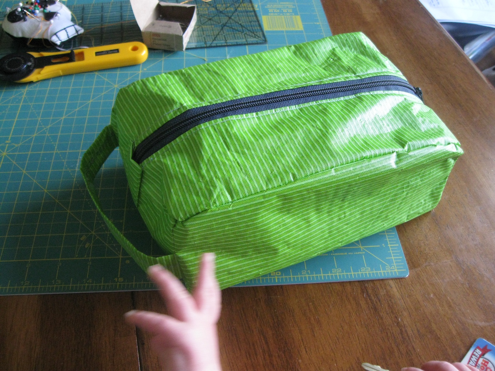 I am counting this bathroom bag as a success. There are a few things I would’ve done differently, but I am pretty happy overall. And, more important, my husband seems to like it. If you read my post last Monday, you may recall that I said this is a stashbuster project, and I stuck with that. Zero dollars spent! I bought this green material two years ago. It is a vinyl tablecloth. It can be a really fun material to work with, but I wouldn’t reccomend it for beginning sewers. It is awfully slippery and holds onto every single wrinkle and fold. Both those factors can make it difficult to create good, clean cuts. But if have patience and good attention to detail, you can have a lot of fun with vinyl.