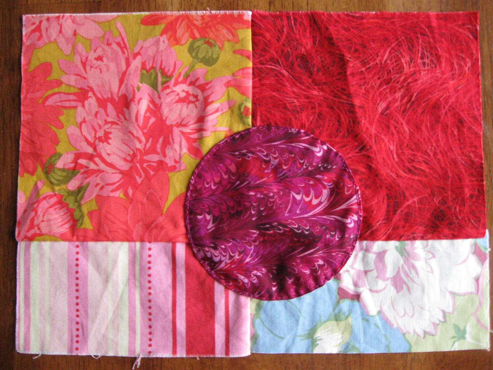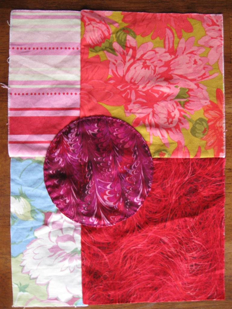 At least I got part of this project done, so I wanted to share progress pictures. Everything you see is handsewn. I hadn’t originally intended this to be a handsewing project, but it’s just so portable. So I ended up doing all my work while sitting at the in-laws. I am happy I gave the circle applique a try. Thanks to this tutorial from Anna Maria Horner, it was super easy. So now all I need to do is add the batting, backing and some topstitching for an accent.