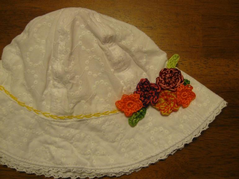 A note on decorating white things. Whether you use fabric or embroidery thread, always pre-wash your stuff. These cute little flowers could easily leave icky pink splotches on the hat. Not a major deal since this is a play hat, but a good thing to keep in mind. In my case, I made the flowers and threw them in a small jar. I added detergent and super hot water, shaking and rinsing until the water ran clear. Then I left them out to dry.