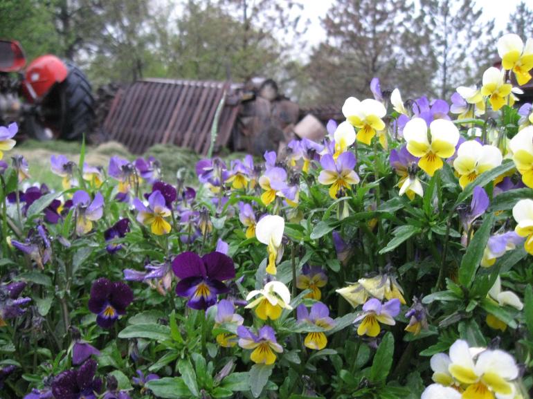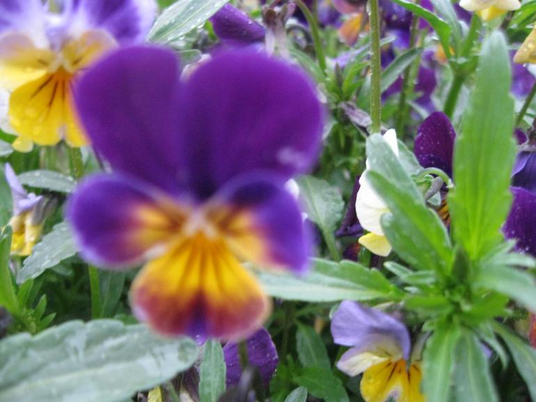 Even though it was raining pretty well Thursday night, I ran out and shot a few quick photos in my back yard. None of them are great photos on their own, but they are meant as inspiration, so that’s okay. I have three varieties of pansies growing by my shed, all in shades of purple and yellow. I just love them.
