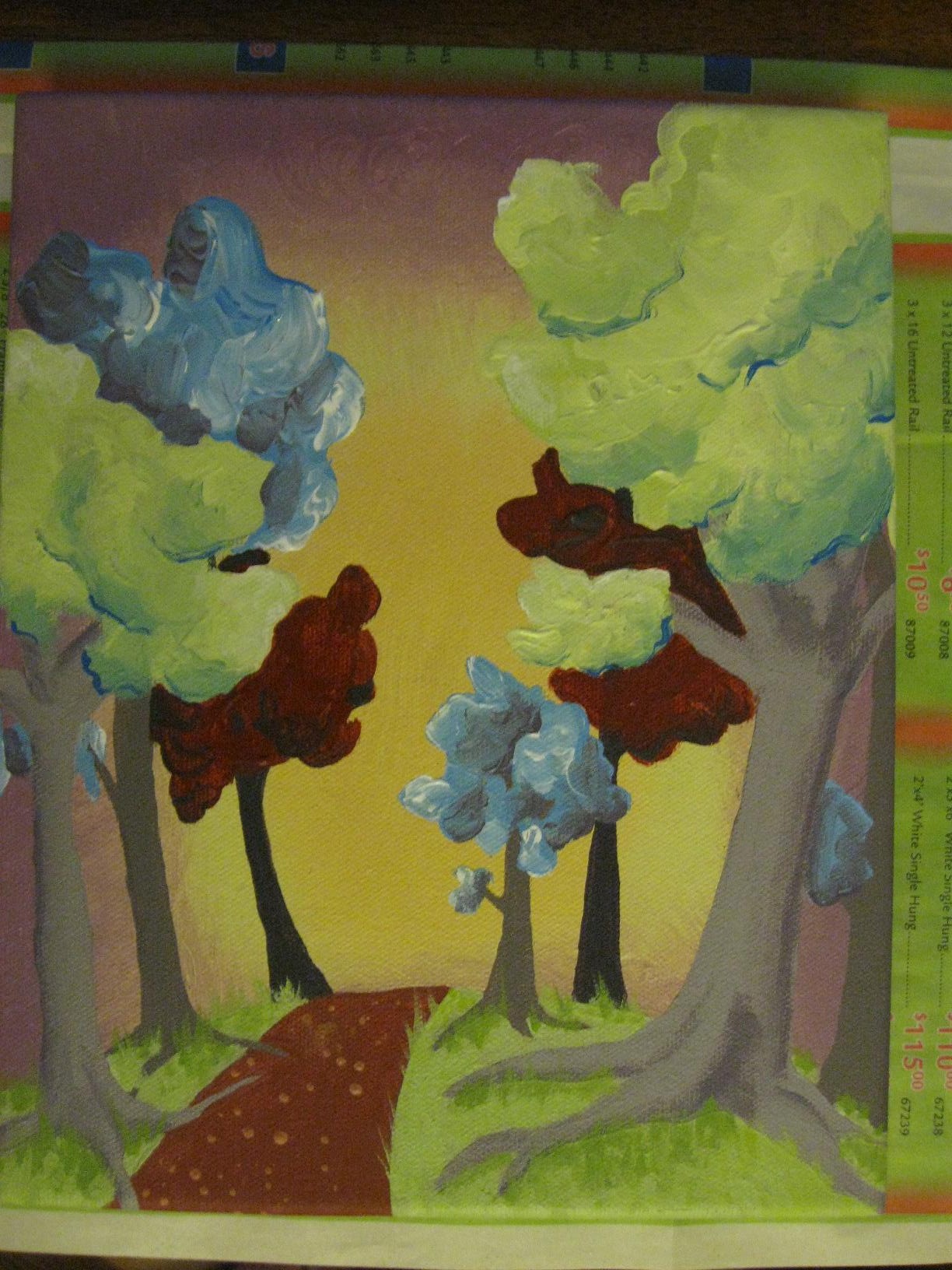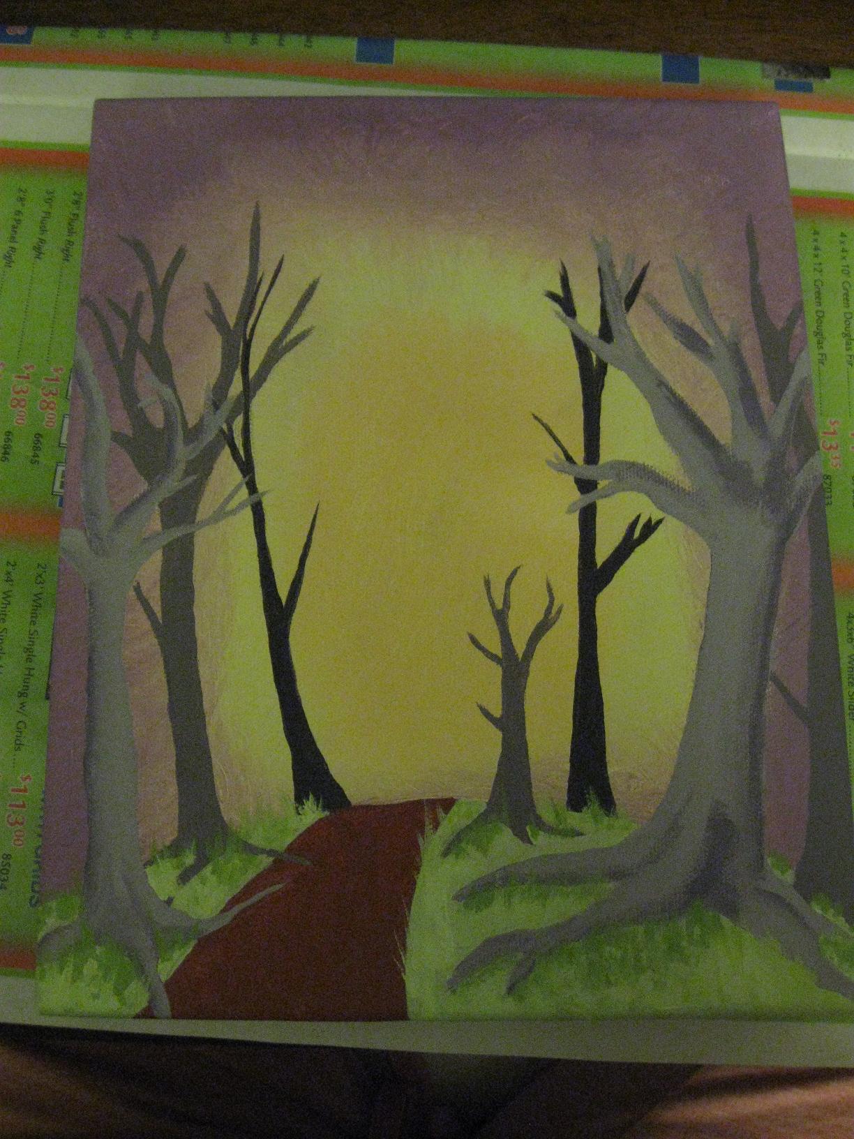 On Wednesday night, I was painting the trunks for the trees, and I hit a point where I wanted to stop. The trunks alone looked okay, and I caught myself thinking “It’s fun, it’s different and I like it”. But then I realized I was playing it safe because I was worried about ruining what I had done so far. So I convinced myself to keep the momentum going and stayed up (way too late) to get it done.