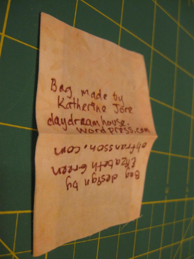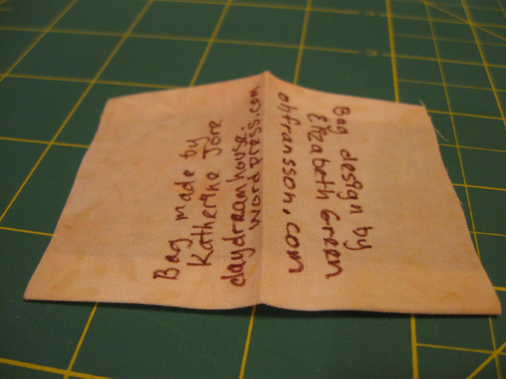 A tag with my name and the name of the pattern maker. Always try to give credit where it is due.