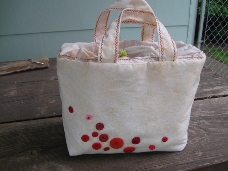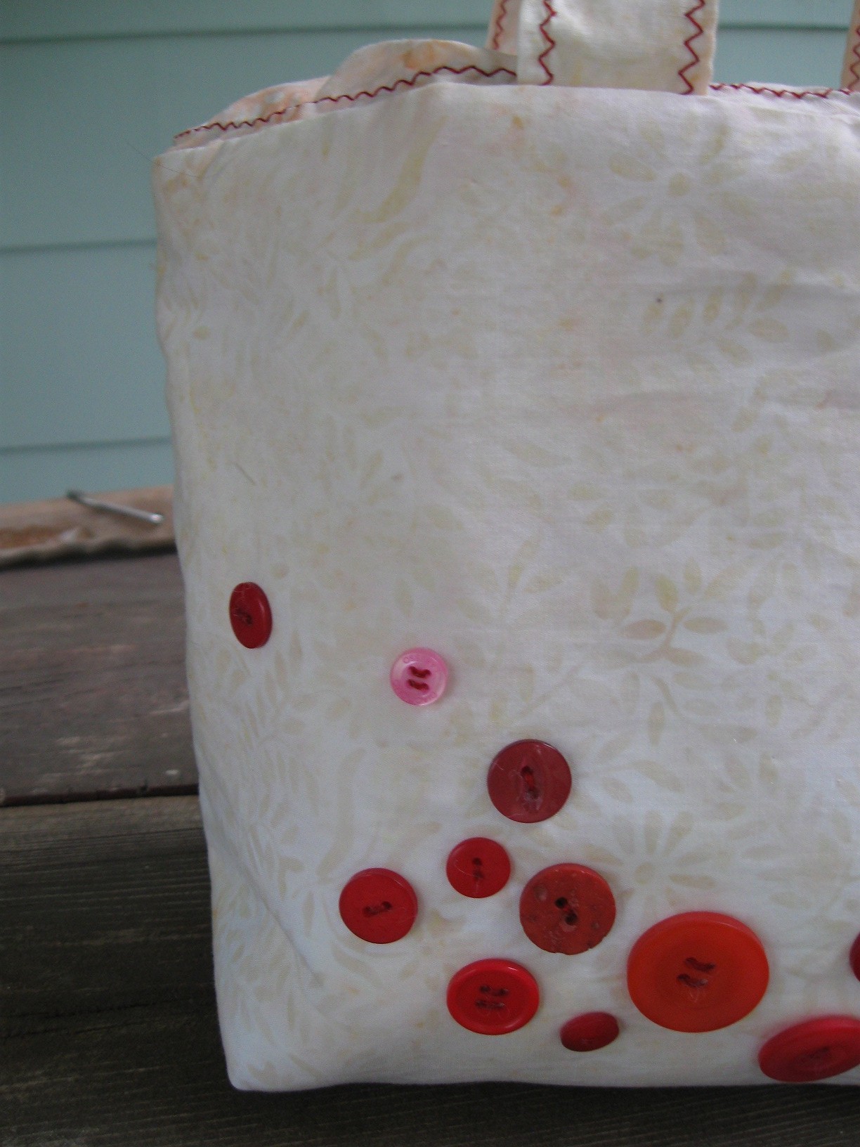 Above you can see the finished bag. I had considered embroidery on the outside of the bag, but I decided to go with buttons that match the inside fabric instead. For some reason, it felt like that might appeal to a broader range of people. Plus, I love buttons! To the right, you can see a close up of the outside of the bag. I wanted to pick a more neutral color for the outside so the decorations would really pop. But red can bleed into other fabrics sometimes. So I came up with a two-fold solution. First, I washed both fabrics in hot water and dried them on a warmer setting than I usually do. Second, I chose a batik with touches of red and orange. That way, if the red ever does bleed, it will be camoflouged by the existing colors. I also bought a package of InsulBrite and sewed in a layer so any food inside will stay cooler longer. This picture gives all of you a close up of the super fun buttons I added to the outside. I chose them all to coordinate with the interior fabric. My favorite is the one to the upper left of the large button. Up close, it has little eroded bits that make it look like coral.