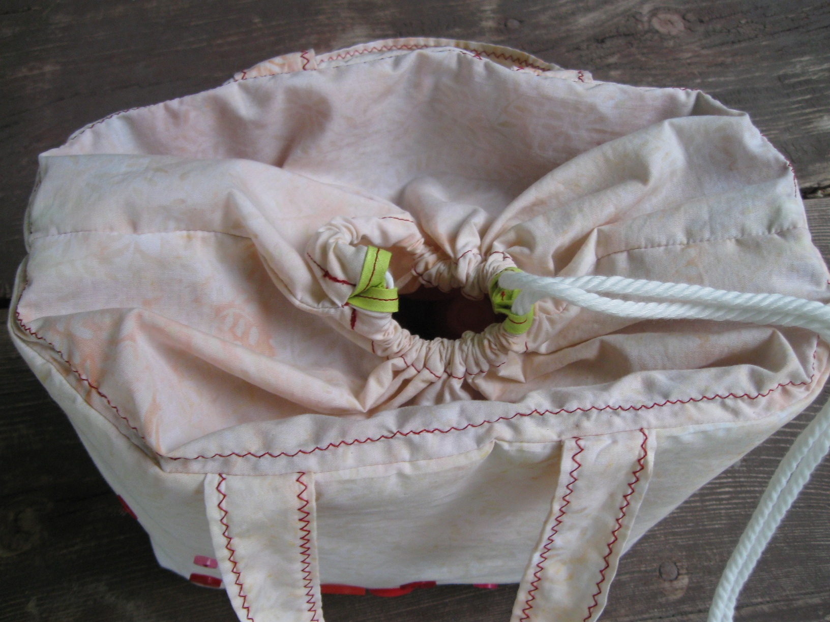 I was hoping to find a bag pattern that had some sort of flexible closure. Currently, if I have to bring extra food to work for any reason, I can’t close my lunch bag at all. Then I have to carry it very carefully so nothing falls out. So I was thrilled to find this pattern had a drawstring top. That part is not insulated, but I figured hopefully I that wouldn’t be too big a deal. The important part is that it closes securely AND can expand to fit more food if the day calls for it.