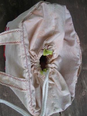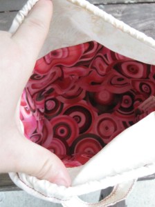 And ta-da! The beautiful inside fabric. It’s one of those fabrics that I liked, but couldn’t picture using for myself. But I think this is a perfect application for it. I love bag that look quiet and unassuming outside and then — KA-POW – you open up to this bright, fun print. It’s a really good contrast. Now I just need to find some fabrics and make a version for myself…someday.