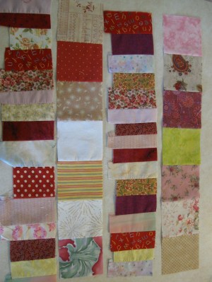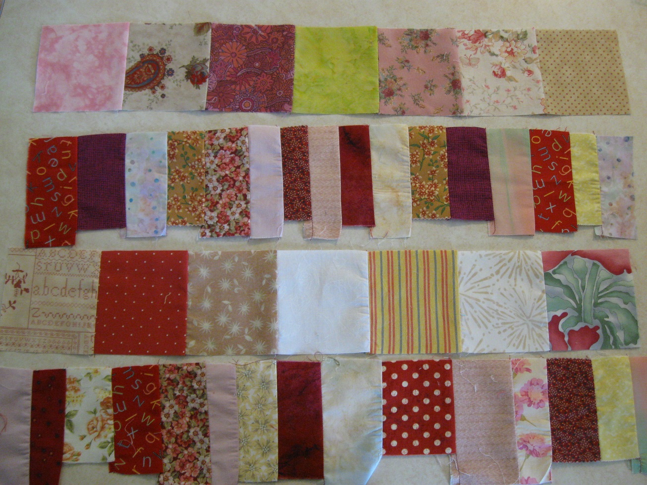But I should probably tell you about the crafting. Since I flat-out refused to do one bit of housework Monday, I actually managed to get crafting AND reading done. Both have not happened in the same day in a loooong time. I did not get my Start Small for last week done, but I should get through it this week. Then I need to take a different look at my crafting mentaility…but more on that later. I did take the fabrics I pressed on Friday and sewed them together for the start of one of the two baby quilts I have to make. I am still wrestling with deciding on a finished layout. But I do know these long strips will have long strips of one fabric between them. I will also be adding some applique on top as an accent. But that will have to wait a few weeks until I get back to the fabric store. I promise that I will present a step-by-step photo post of both baby quilts.