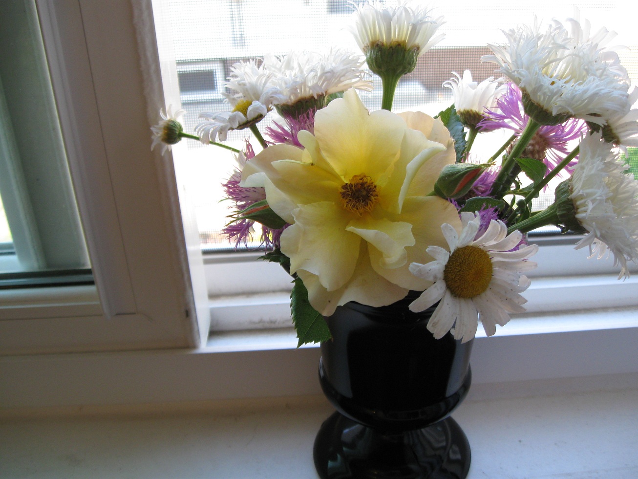 The whole family spent a great deal of time outside this weekend, so I had to bring some of the outside back in. After the little lady went to bed last night, I snuck outside to cut a few flowers. In my pansy post, I talked about the previous owner’s attention to color. It makes it so easy to create a casual, yet cohesive arrangement when the colors already go together well.