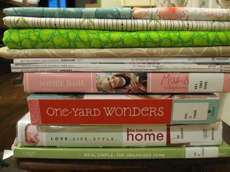 After a lot of waiting and dreaming, I finally made it back to my favorite fabric store in town. Even better — I managed to spend 45 minutes in there and not blow my budget. Craziness! Combine that with a very successful trip to the library, and I have an awesome weekend ahead.