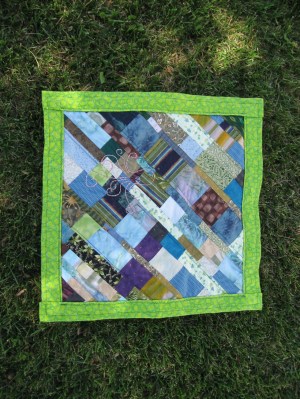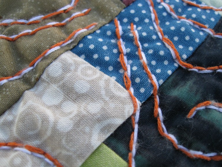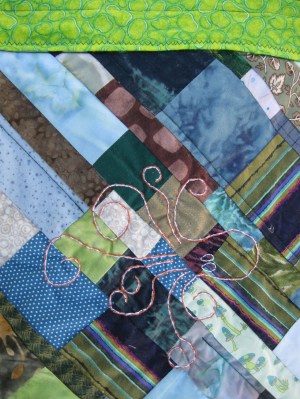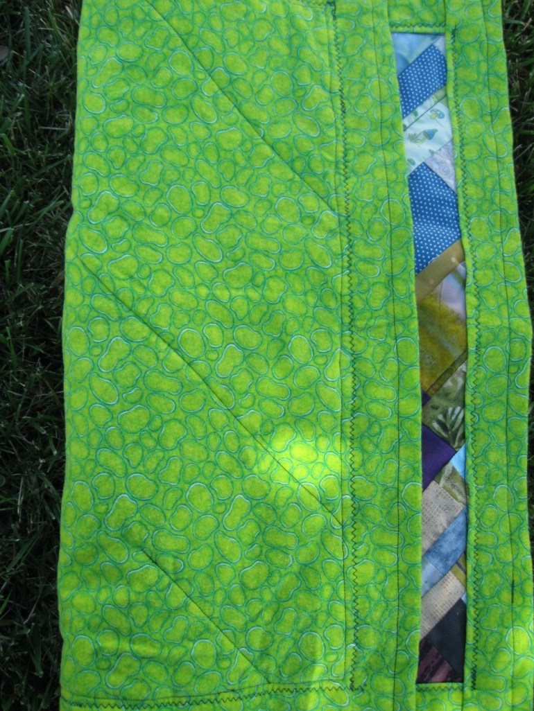Going to the opening reception and working late both managed to kill my sewing time Friday night. And I also spent a good chunk of Saturday making pasta with the little lady an my husband. But I somehow made up that time Saturday and Sunday and got the blanket finished in time for the party. I am thrilled with how it came out. Lots of long strips of fabric scraps all came together to create something really fun, and not traditionally baby. Best of all, half of the fabric was from my stash. I bought two fat quarters to add some brighter colors, and then I bought the flannel for the backing. That’s my favorite part of using materials from my stash — when I do have to buy materials, I can buy really good stuff without feeling like I spent too much.