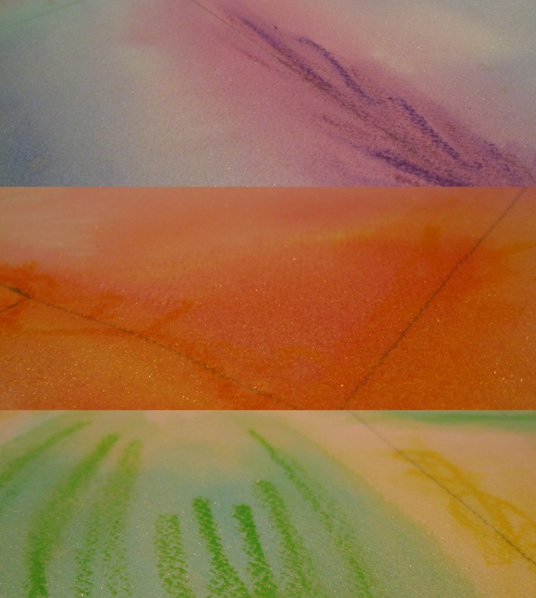 To make things easier on myself, I did all the backgrounds in bulk. After drawing out the cutting lines, I added watercolors. Once those had partially set, I added some water soluble oil pastels and a bit more water.