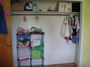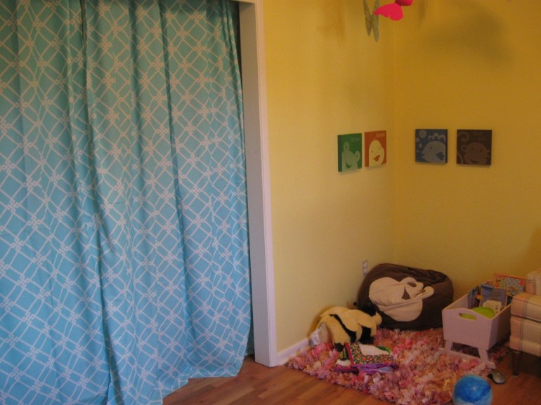 Ever since we moved into our house a year and a half ago, I’ve been wanting to get rid of the closet doors in L’s room. There was nothing wrong with them, but they were just basic track doors and she’s been able to pop them off since she started walking. My Dad was nice enough to get me the curtain wire kit I wanted from Ikea, but it’s been sitting in the closet since last spring. Partly because I was being lazy, but I was also trying to find the perfect fabric. The amount of fabric I needed would’ve been really expensive if I bought anything really nice, so I was holding out for something like curtains or tablecloths. A few months ago, I found the perfect tablecloths at Target for about $5 each. Then those sat in the closet until this week.
