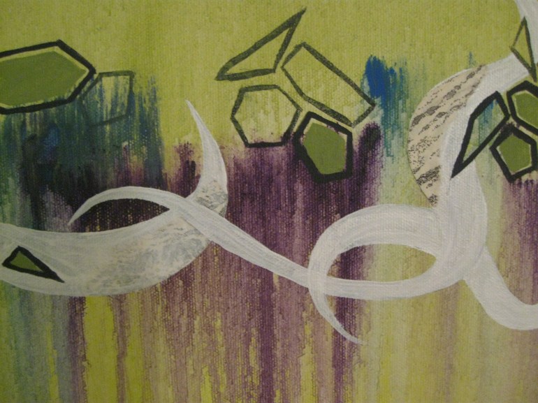 After a few days of my latest painting sitting next to my bed (RIGHT next to my bed) I finally figured out what it needed. So I added a few bits of paper from an old book I had chopped up years ago and called her quits.
