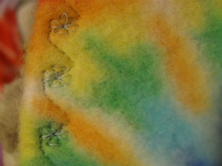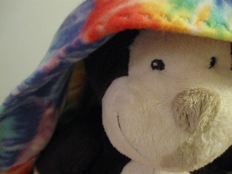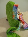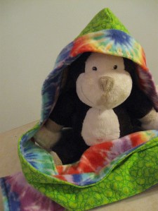 Well, I started this project over the weekend and thought I could get it done before the weekly grind started up again, but I was wrong. But I didn’t have anything else going on tonight, so I was able to wrap it up. October in Montana means the cold is not far off. My Mom had a pattern for this hood with a scarf attached, which I figured would be perfect for my little toddler. Even better, I already had tie dye polar fleece and lime green flannel in my stash already, so I didn’t have to spend a dime, and you already know how much I love a good stash buster project.