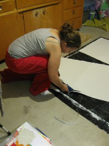 Nothing crazy going on here. Just wanted to prove I did something this weekend after a lot of procrastination. I got my entire canvas primed, cut out my floor cloth nd put down the first layer is paint. Now I just have to make sure I get up super early to put down the next base coat. Wish me luck.