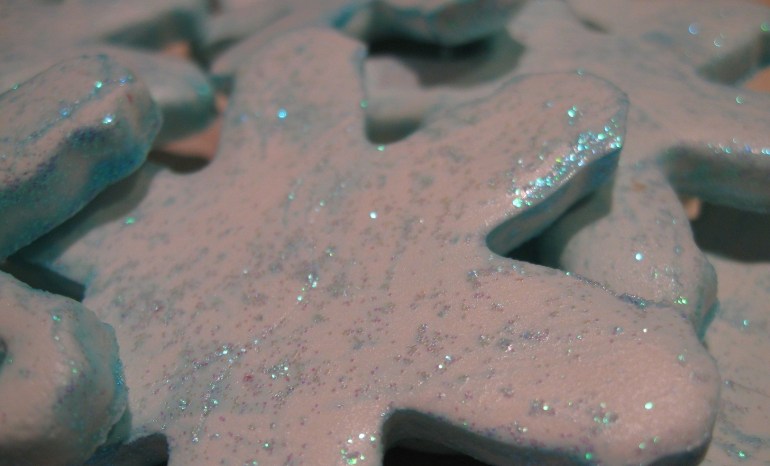 So I never officially announced a Start Small project for the week, but I still finished a good small project. The Model Magic snowflakes I made earlier in the week got a double coat of light blue glitter paint. I have to say, I like them even better now than before. Plus, it helped disguise my less-than-stellar rolling job. Originally, I was going to tie all of them onto a long piece of string to hang it from the dining room window. Instead I think I will hang a short string of lights in the window and hang the snowmen off of that. Hopefully the lights will mean they can be pretty and sparkly even when it’s dark. I always love creating something that is low-budget, but doesn’t look like it at first glance.