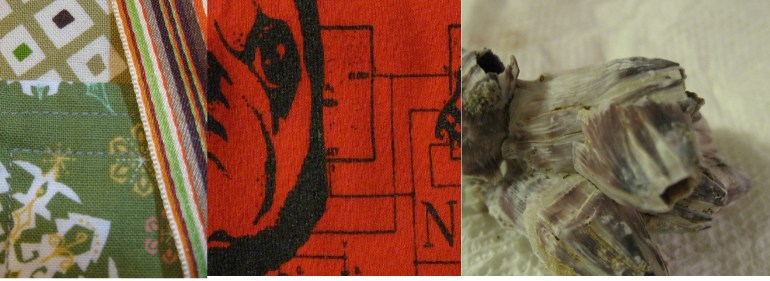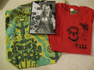 Despite a minor setback in my day in the form of my car not being ready, this day actually ended up being pretty awesome. A routine trip to get dog food turned into dog food, one of my angel tree gifts and three shirts on sale for me. Then when I got home, there was a package waiting for me. I knew my friend Carly was sending me some barnacles after a comment I made on her blog, but I got so much more. She went me an awesome new bag she made (in my favorite colors), a beautiful screen printed shirt, a pin and a collaged sketchbook. She must have read my mind…I was just thinking last night that I am going to need a new sketchbook very soon. She also sent me a really fun bundle of paper scraps as well as a tile and piece of chain. It just makes me want to get collaging! Make sure you come back here on Friday when Carly will be guest posting for Firestarter Friday.