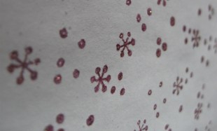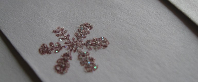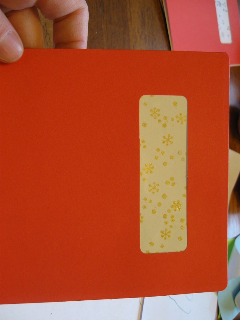 The fronts of the cards had a landscape format hole cut in them, and I needed something to fill that in. I had a few holiday stamps, metallic ink and embossing powder. While my little lady was napping, I stamped and embossed like crazy. I figured doing the messy part while she was sleeping was a good idea. Good tip in case you want to emboss and don’t own a hair dryer like me — use a hotplate or large griddle set to about 250 degrees. That little trick worked great for me. Once all the elements were made and cut, all I had left was assembly.