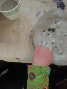 Once we got to the class, they set her up with a lump of clay and an apron that covered her shoes. We settled in and she spent a good five minutes surveying the room. She is at that toddler stage of staring, and there were a lot of people to stare at. Eventually, she got interested in the clay, especially when she realized she could make marks. She was pressing her fingers into the clay to make “mittens”. We sat there for quite a while while she poked, stabbed and squished the clay with every tool in sight. Painting was also an adventure. She quickly tired of painting on the clay and opted to paint her hand so she could rub the paint in. It was really messy, but really great. We both had fun and obviously, I’m thrilled she took an art class.