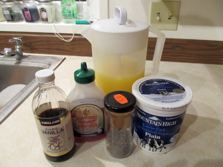 The other stuff. For my liquid I choose juice. Mostly because I can just stock up on the frozen cans and be prepared. You can also use something like V8 Splash. I also use plain low-fat yogurt because I use yogurt for a lot of marinades. If you used vanilla yogurt, you could leave out the vanilla or sweetener. Chia is full of the same omegas you get from fish. Since I have a fish allergy, I try to work chia into my diet.