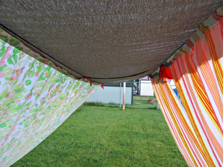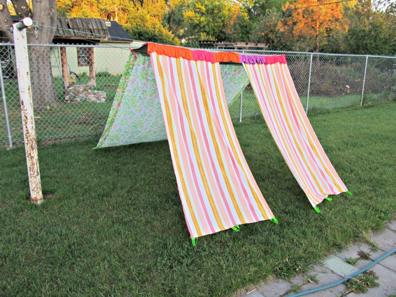 Overall, the construction was really simple. The striped sheet was fitted and had to be cut down. I knew that would be the trickiest piece of fabric, so I started there. I had some rough dimensions, but nothing set in stone. Precision is definitely not a word you would use to describe this job. I cut that sheet into two panels, hemmed three sides and added the stake loops.