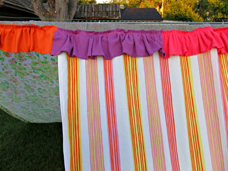 After that, I just assembled all the pieces. The ruffles were the very last piece I did. I just cut really long strips of four-inch wide jersey. I ran a single stitch along one edge to ward off fraying. Then I did a much longer stitch along the other side and my machine just ruffled it up for me. And I must have racked up some good sewing karma because the ruffles were exactly the same length as the tent. It was strange and perfect.