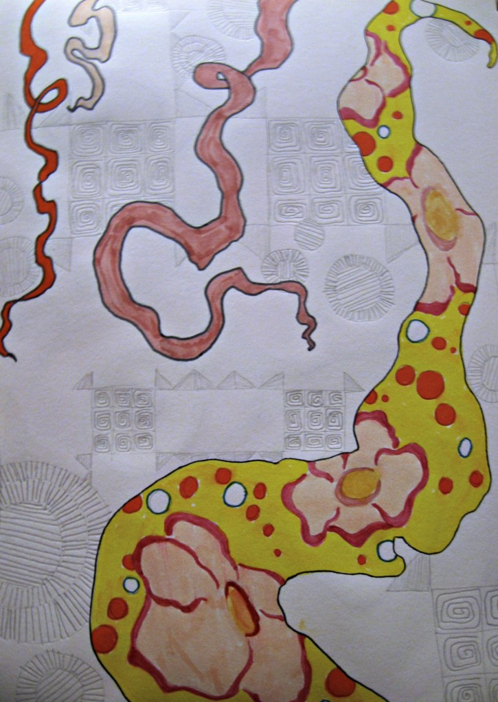 Last night after finishing my daughter’s scarf, and put away the yarn and crochet hook in favor of paper, pencil and markers. I wasn’t feeling like doing any direct drawing from life. A literal translation of a plant or anything else I had shot a picture of in this process seemed too easy. I wanted to take it a step further and combine elements from several different things I have seen. And after seeing the shrinky dink necklace Alisa has on her blog, I kind of want to make my own.