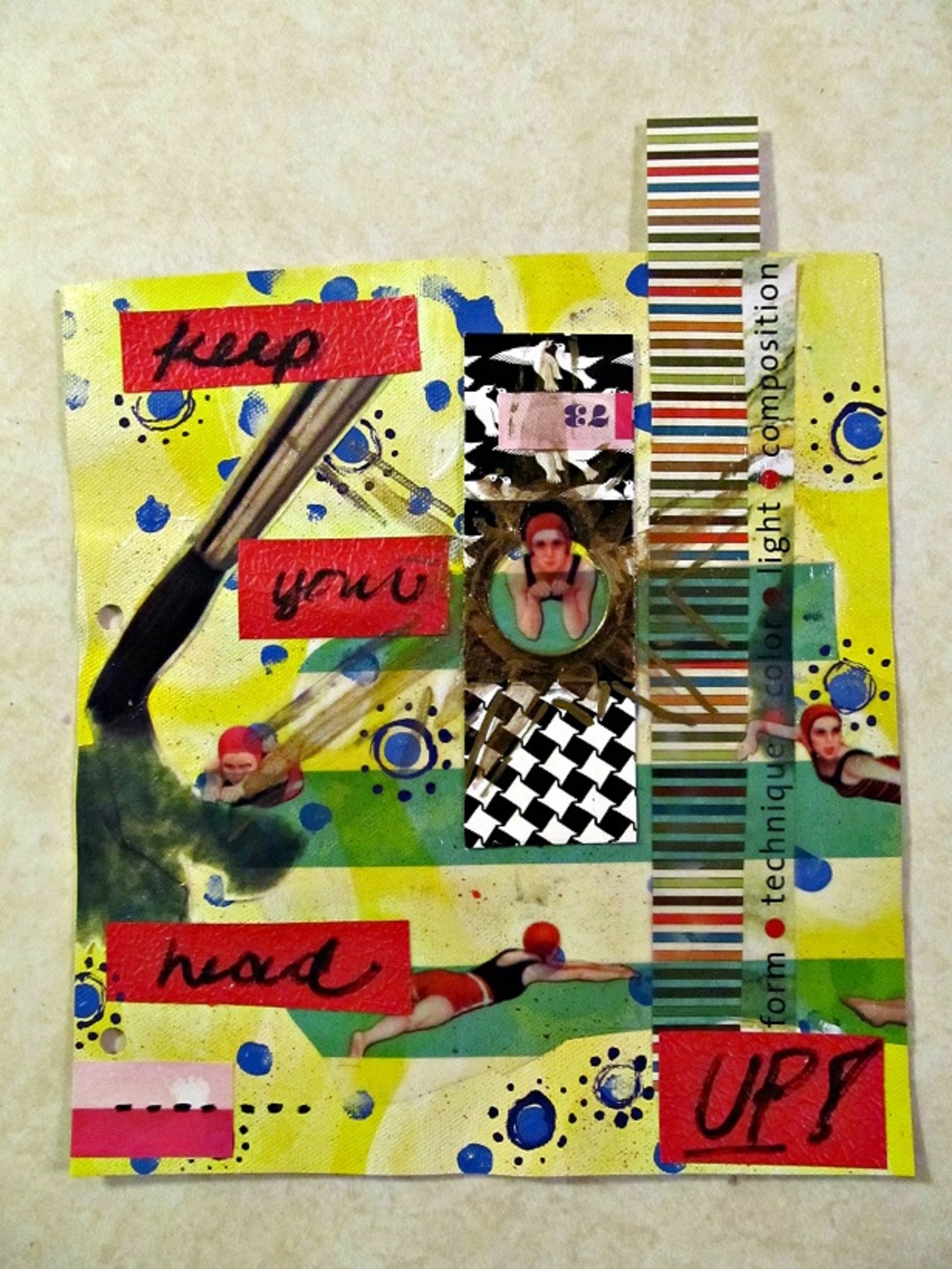 As I was trying to just do a journal page, I reached for two materials I don’t use a ton of in my journals. The base of this page is a scrap of canvas with a yellow background and blue dots. It’s a leftover from an old project, so the color and pattern were already there and waiting for decoration. And such happy colors are wonderful for making a page like this one where I am trying to encourage myself. On top of that, I did add papers and a bit of paint, but the large, very shiny piece with the swimming ladies on it is scrap vinyl. I believe it was a shower curtain at one point. You don’t get much further from paper than that.