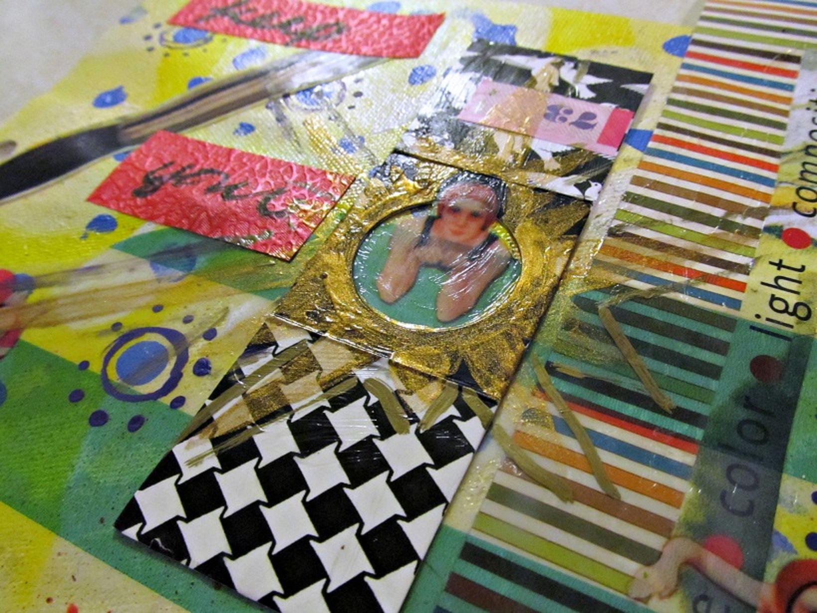 If canvas and vinyl are too far outside your comfort zone or you just don’t have any “strange” materials, just consider adding something you have never used to a standard paper journal page. Beautifully printed tea wrappers, fabric scraps, foil from candy bars, bubble wrap, old postcards and patterned napkins are all good options and pretty readily available. As you get more and more into visual journaling, you will find yourself unconsciously saving materials like these for just this type of project. And if you REALLY get into it, your family and friends will hop on board as well. It’s amazing how many cool materials will just start to materialize. So get them and use them! You may end up finding a new favorite material.